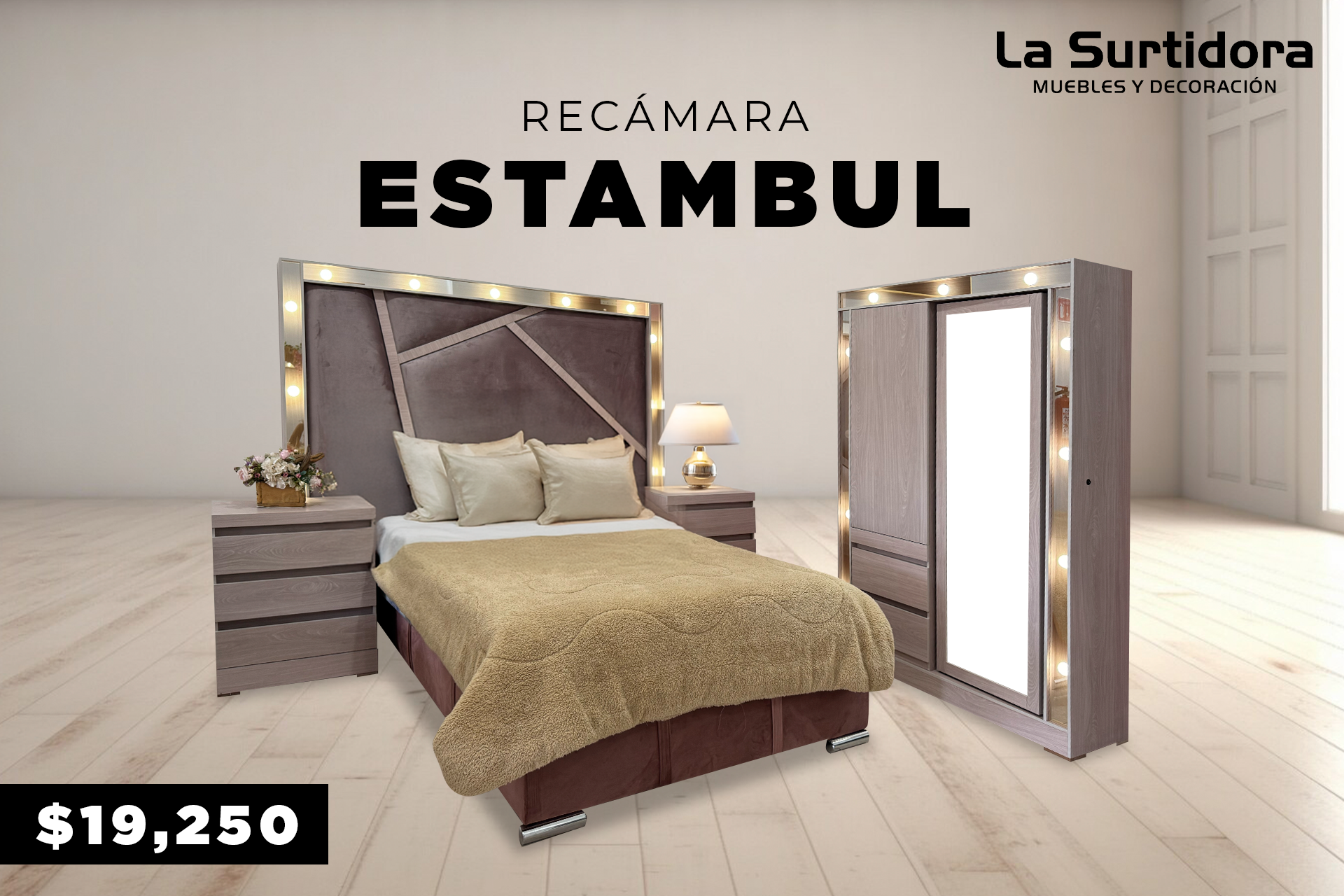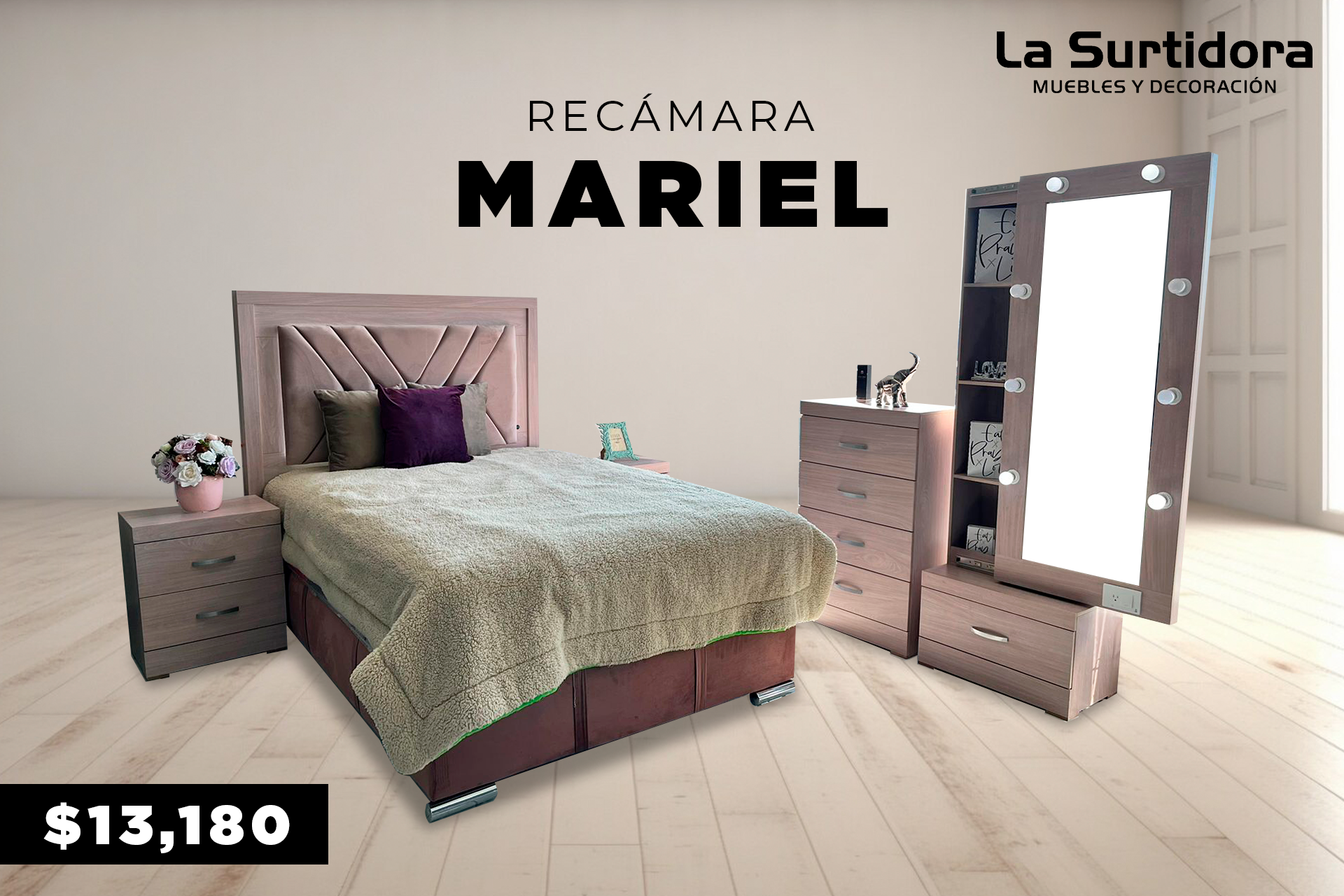 $26,190.00Burós con amplio almacenamiento, cabecera con diseño vanguardista e iluminación integrada, cajonera multifuncional con amplio almacenamiento, espejo con iluminación integrada con almacenamiento en la parte posterior y puerto de carga e interruptor en espejo